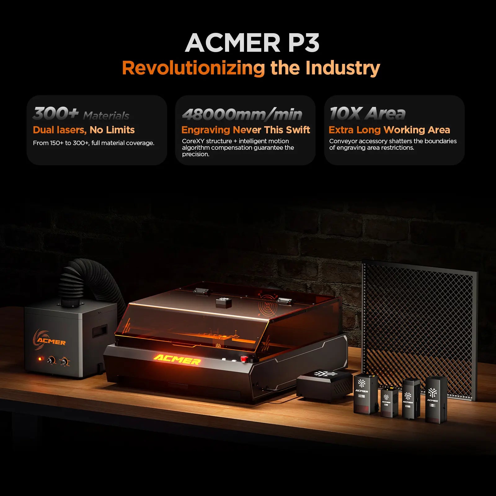 The maximum engraving size for the ACMER P3 depends on the laser modules and the presence of a conveyor. With a 24W diode laser or 2W IR laser, the maximum engraving size is 400mm x 400mm. For models with a 48W diode laser or dual-laser, the maximum engraving size is 400mm x 390mm. However, if the machine is equipped with our optional conveyor, the engraving size can be expanded to a maximum length of 4000mm, allowing you to engrave larger objects or continuous designs.